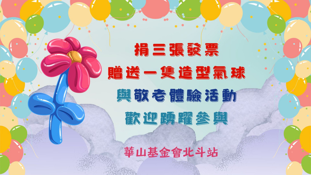 ✨華山基金會:捐贈三張發票可獲贈精美「造型氣球」及「敬老體驗」。