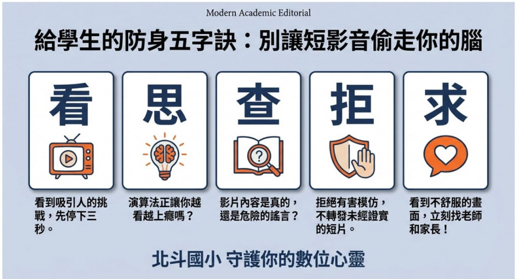 當前短影音風潮對學童的衝擊不容小覷,我們特別提出「思辨、查證、要求助」三大行動策略: