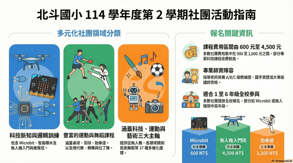 新學期即將開始,本校為了提供孩子豐富的多元學習機會,114 學年度第 2 學期精心規劃了多達 27 個學生社團,包含科技、運動、音樂及舞蹈藝術等類別。歡迎家長參考以下資訊,與孩子一同討論並在期限內完成報名。