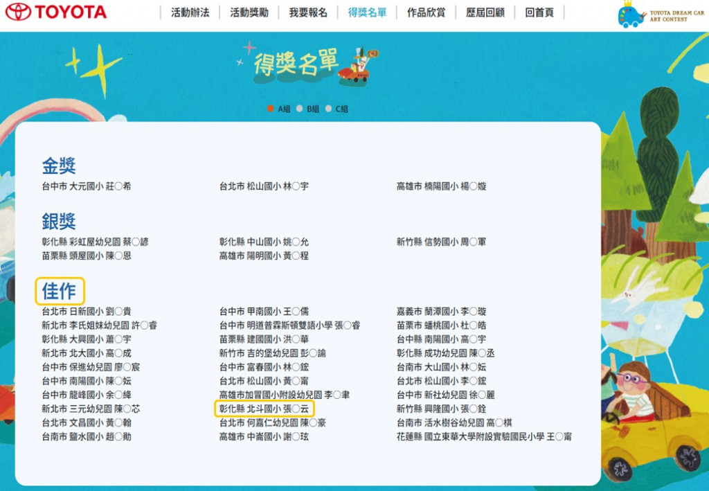 恭喜一丙張喬云同學參加「2026 TOYOTA全球夢想車創意繪畫比賽」,榮獲『佳作』