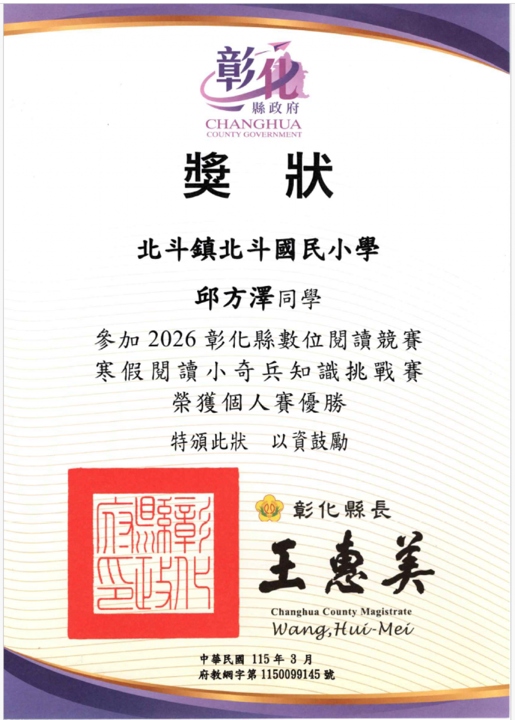 恭喜一戊邱方澤同學參加2026彰化縣數位閱讀競賽-寒假閱讀小奇兵知識挑戰賽 榮獲個人賽優勝