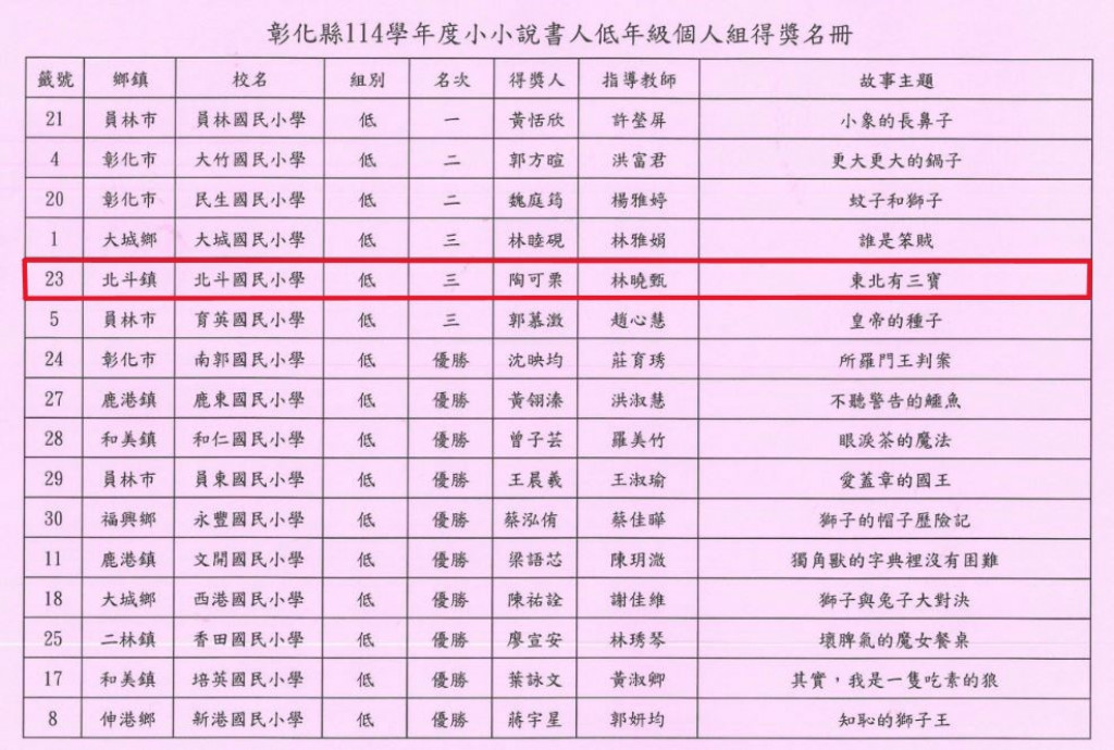 恭喜林曉甄主任指導 三乙陶可栗小朋友 參加彰化縣114學年度小小說書人選拔賽 榮獲第三名