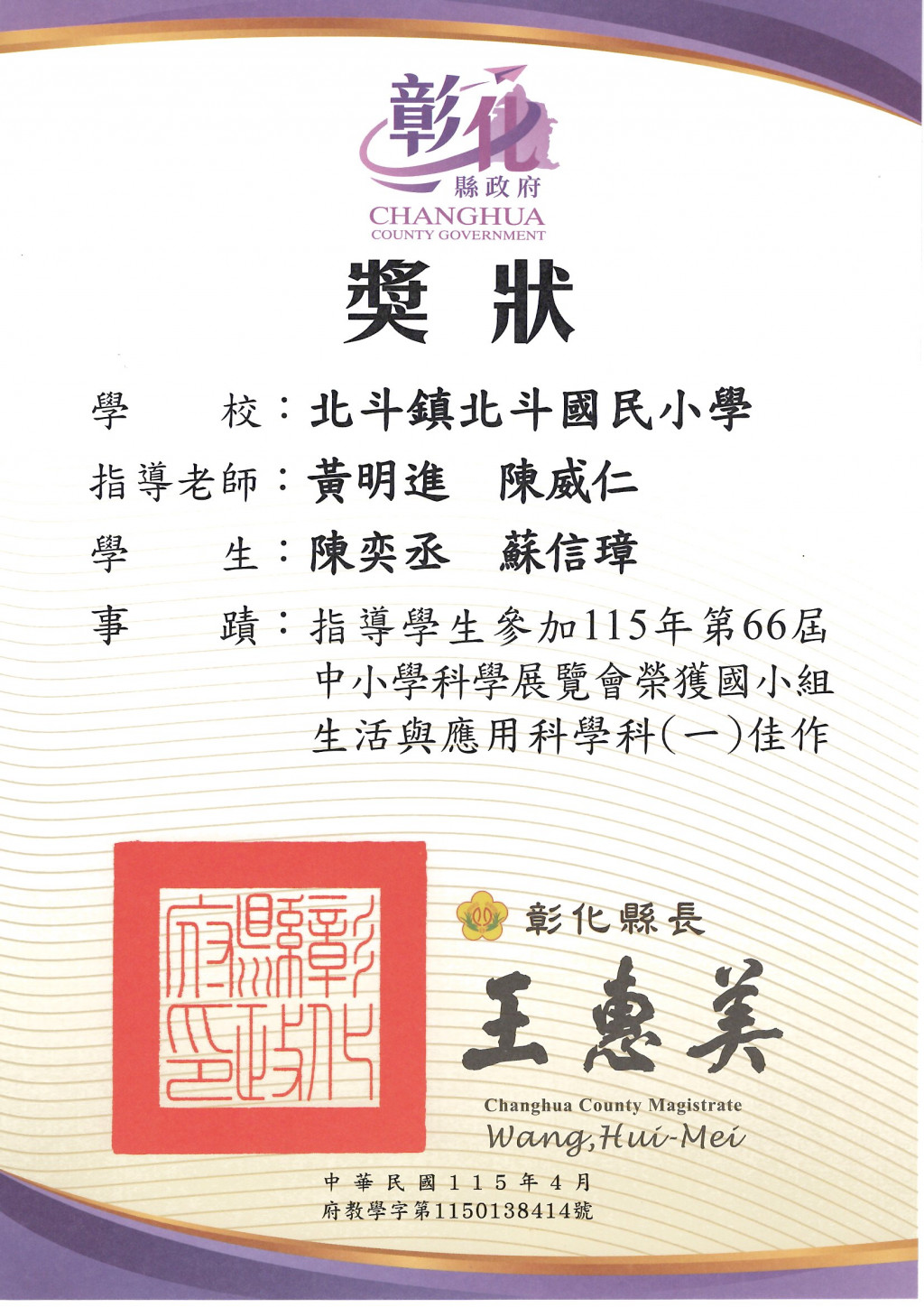 恭喜本校教師黃明進、陳威仁 指導五丙學生陳奕丞、蘇信璋