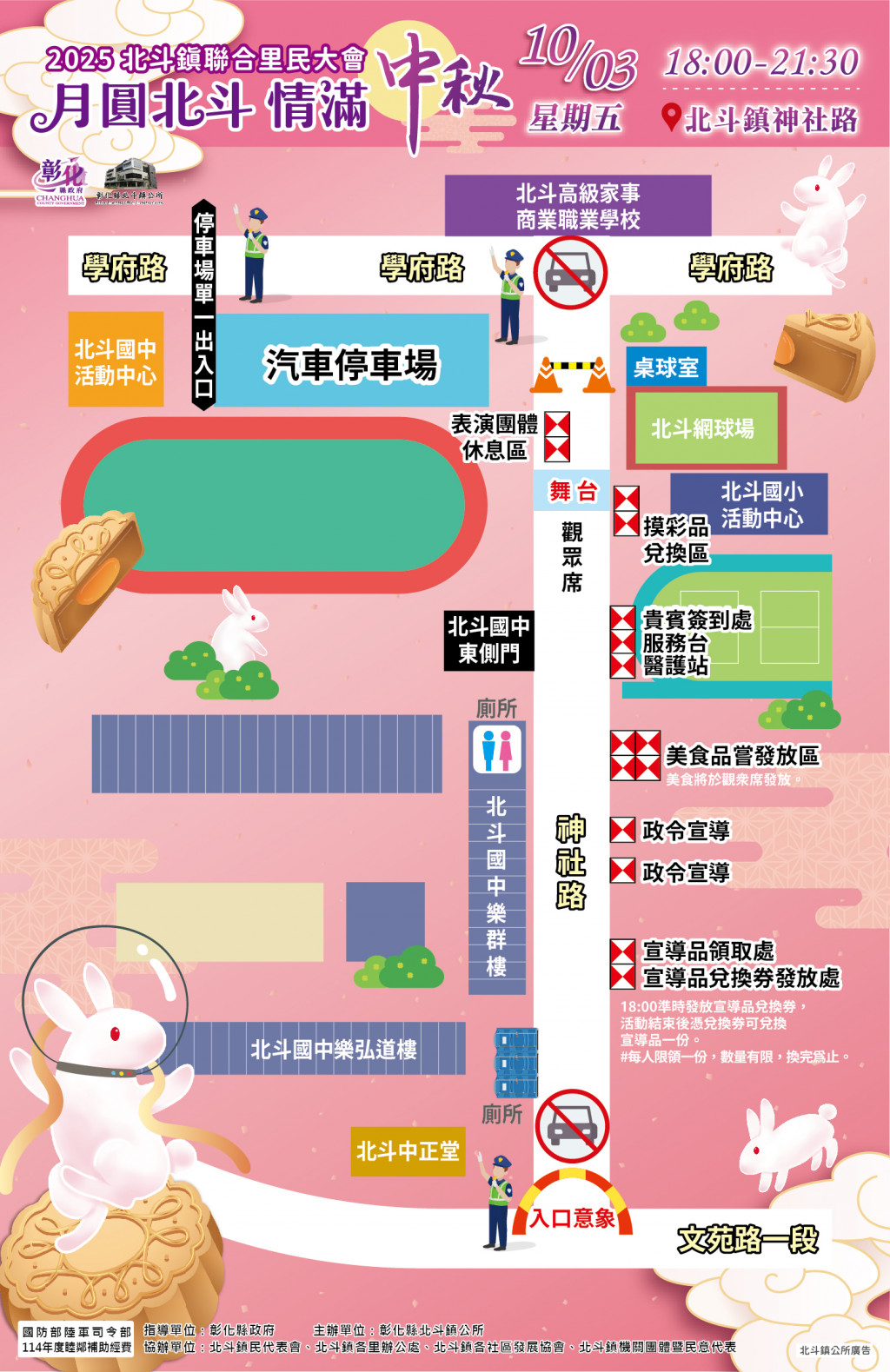因應北斗鎮公所於114年10月3日早上7時至晚上11時辦理「2025北斗鎮聯合里民大會-月圓北斗情滿中秋」活動,神社路進行交通管制。