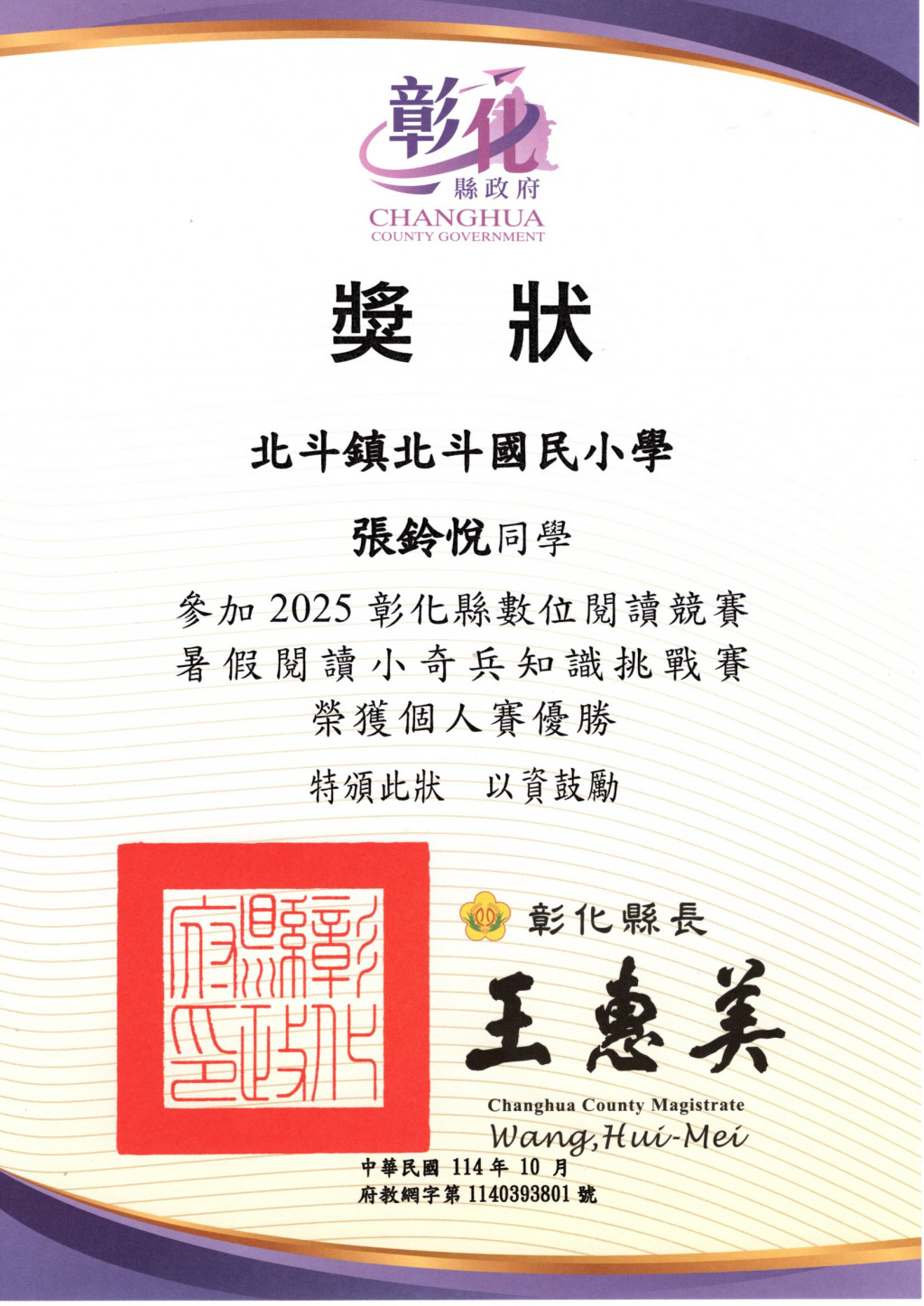 恭喜二戊張鈴悅小朋友 參加2025彰化縣數位閱讀-暑假閱讀小奇兵知識挑戰賽 獲得個人賽優勝