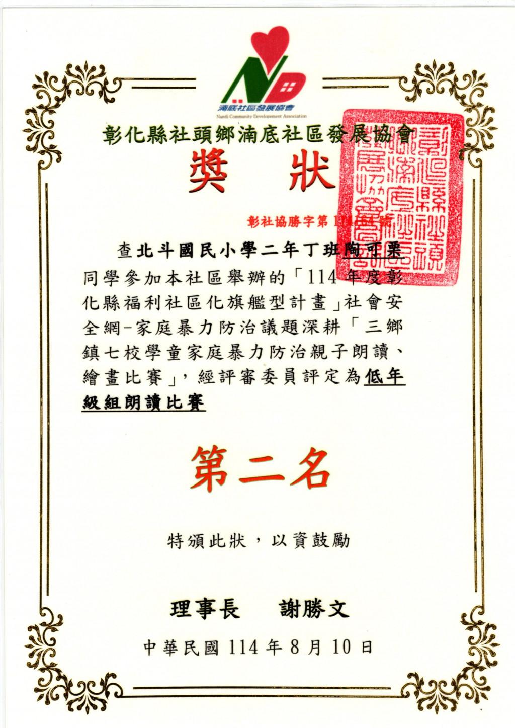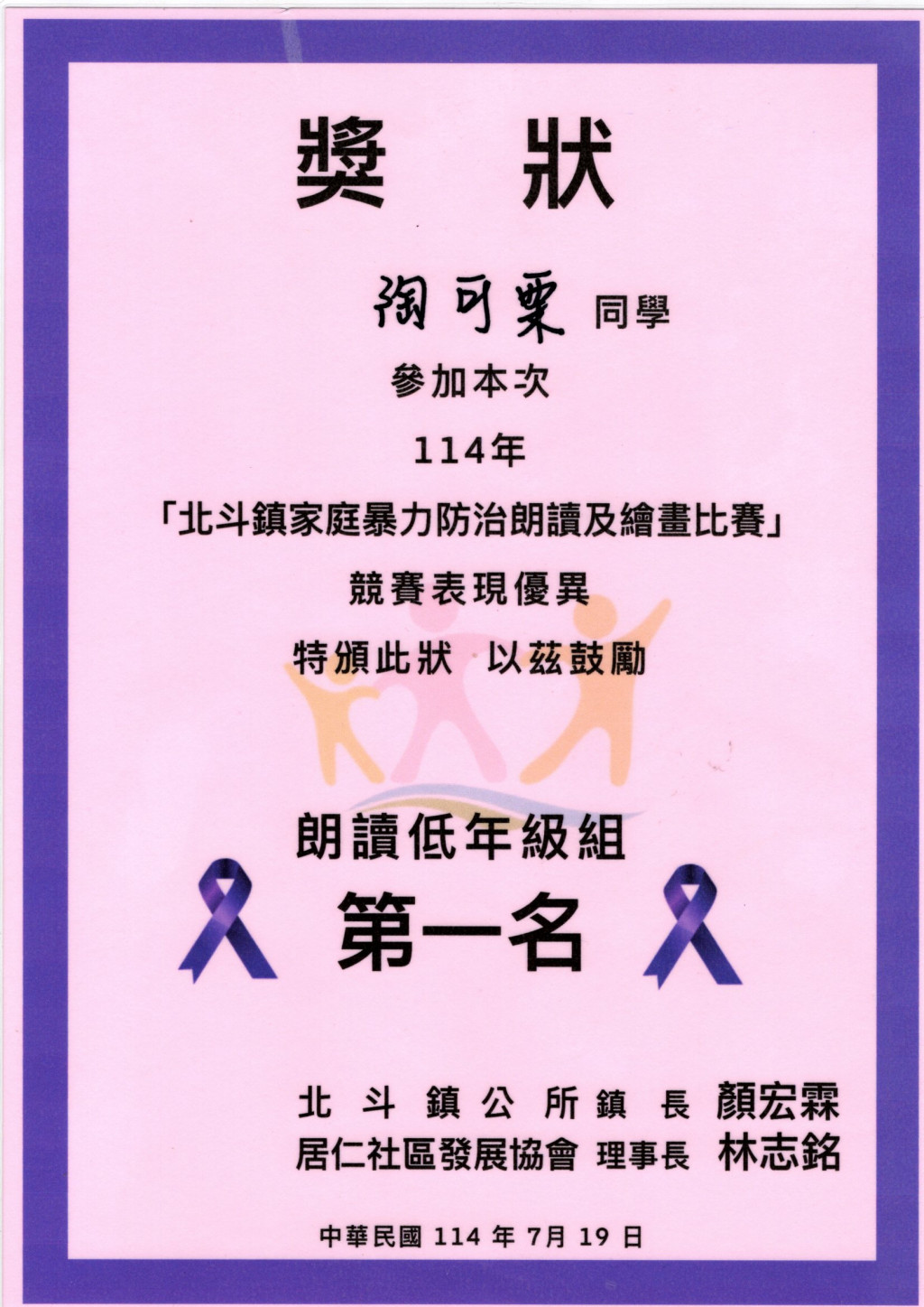1.北斗鎮家庭暴力防治朗讀及繪畫比賽 朗讀低年級組第一名