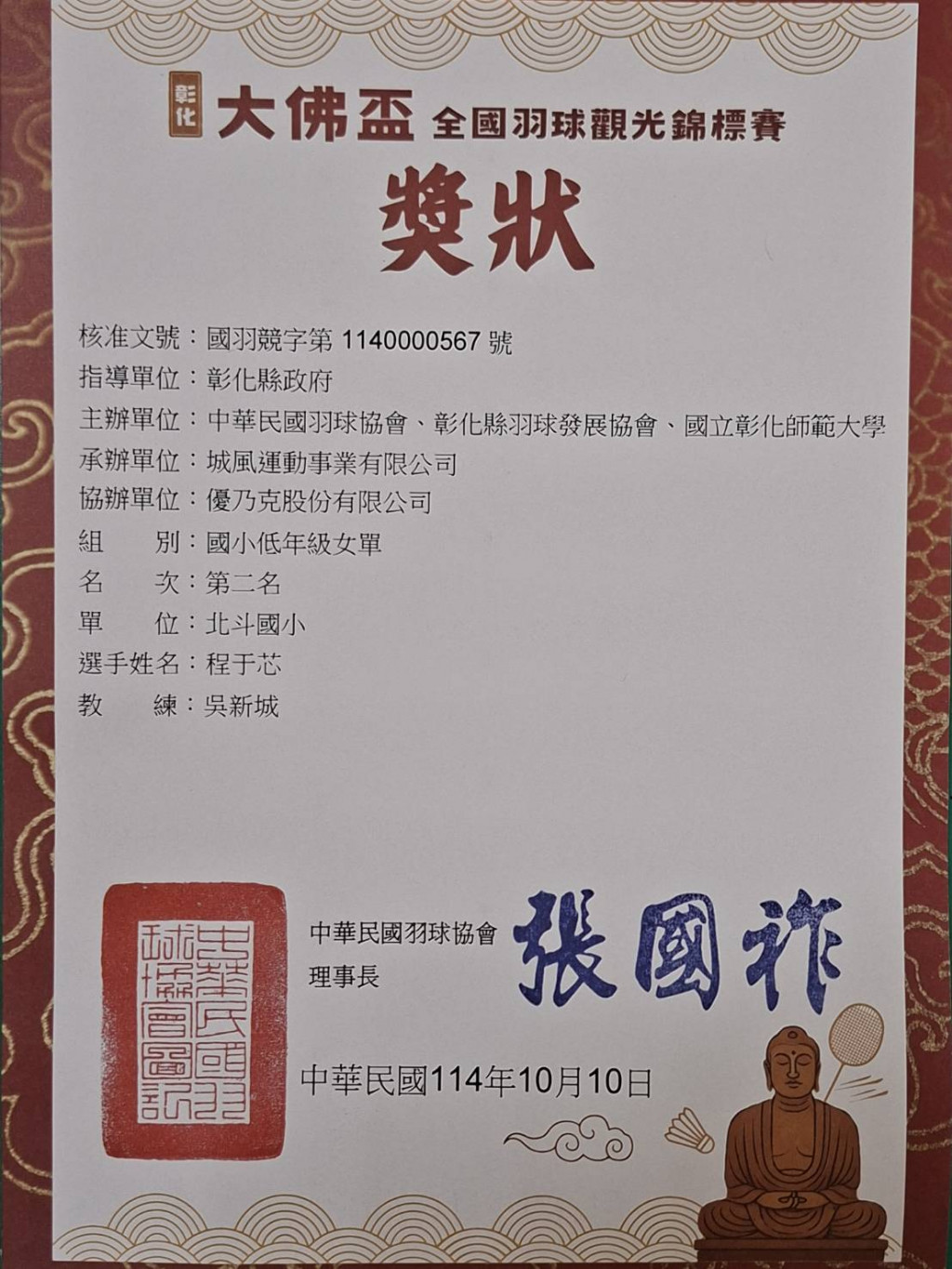 恭喜二戊程于芯小朋友參加2025彰化縣大佛盃全國羽球觀光錦標賽榮獲國小低年級女單第二名