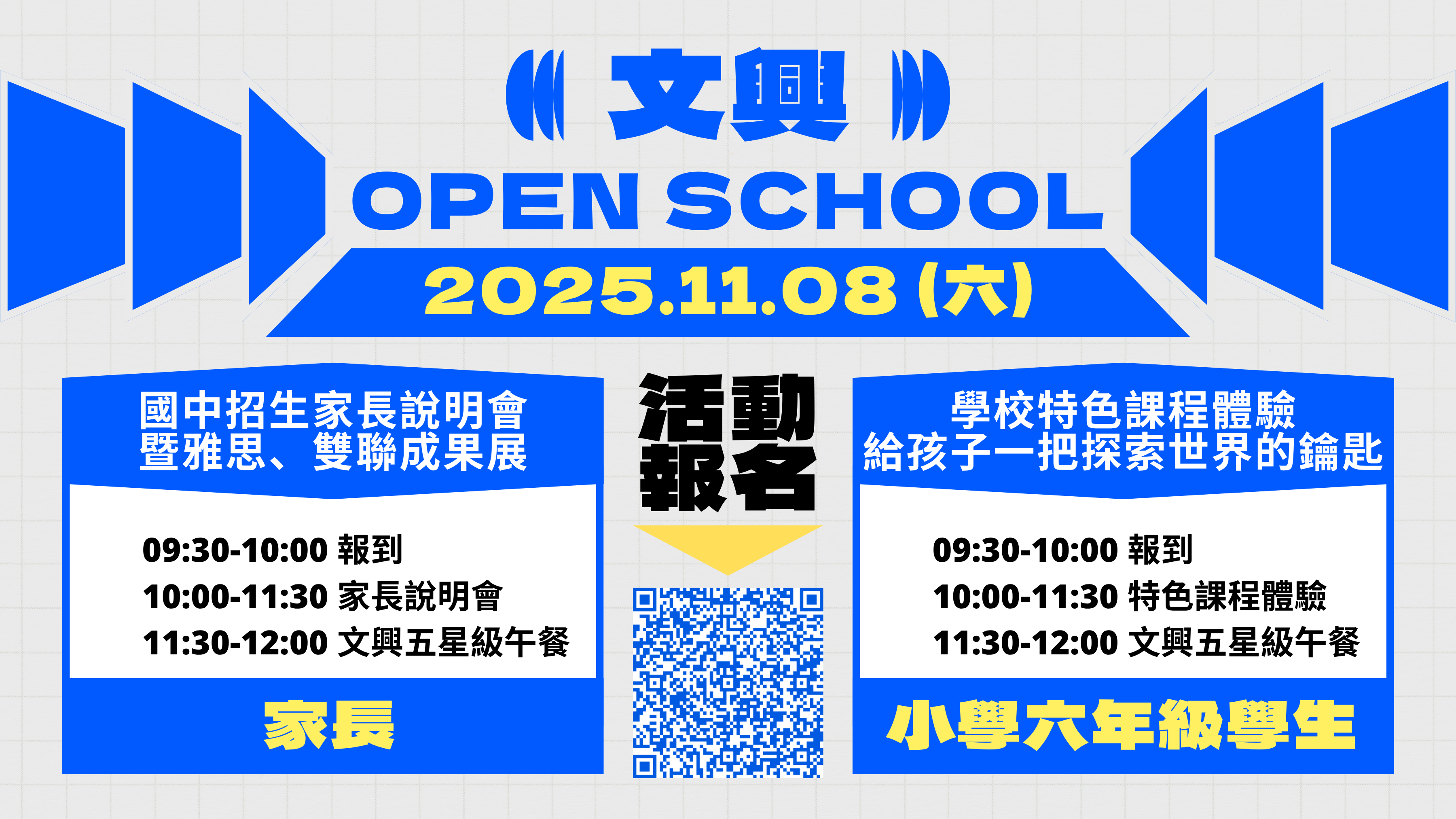 三、 為使社區家長了解本校基督為本的核心教育理念,並讓社區學生認識天主教學校,特於114年11月8日(六)上午文興OPEN SCHOOL DAY辦理學生闖關遊戲及家長說明會,活動說明(如附件三)。