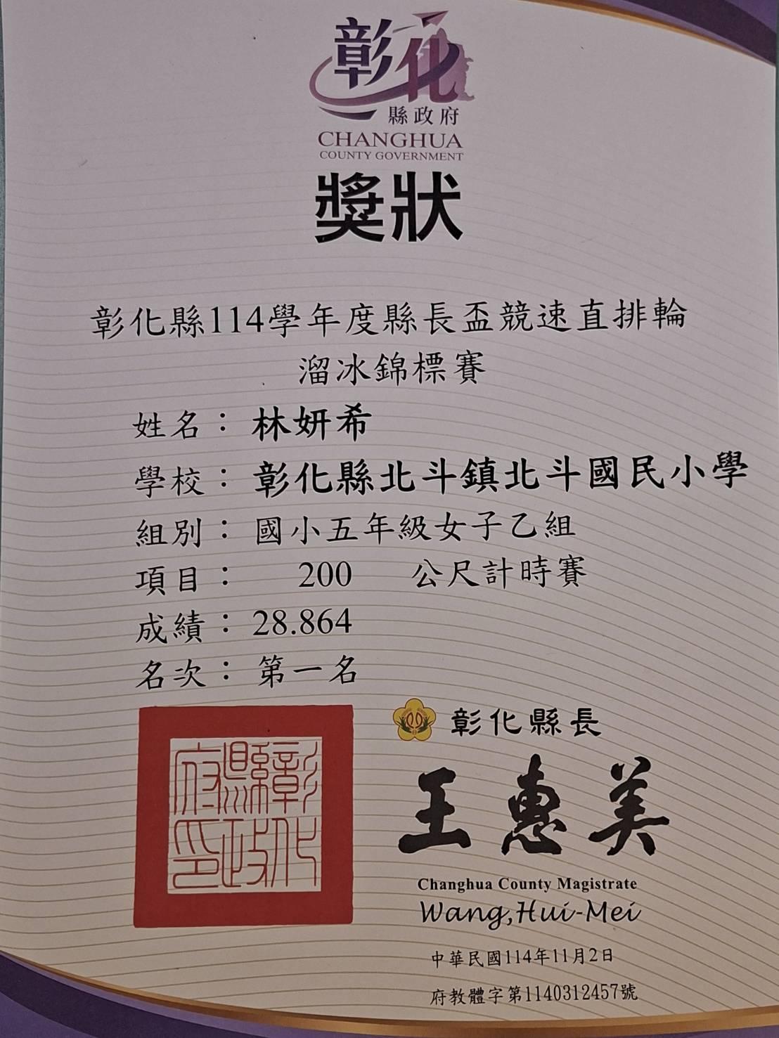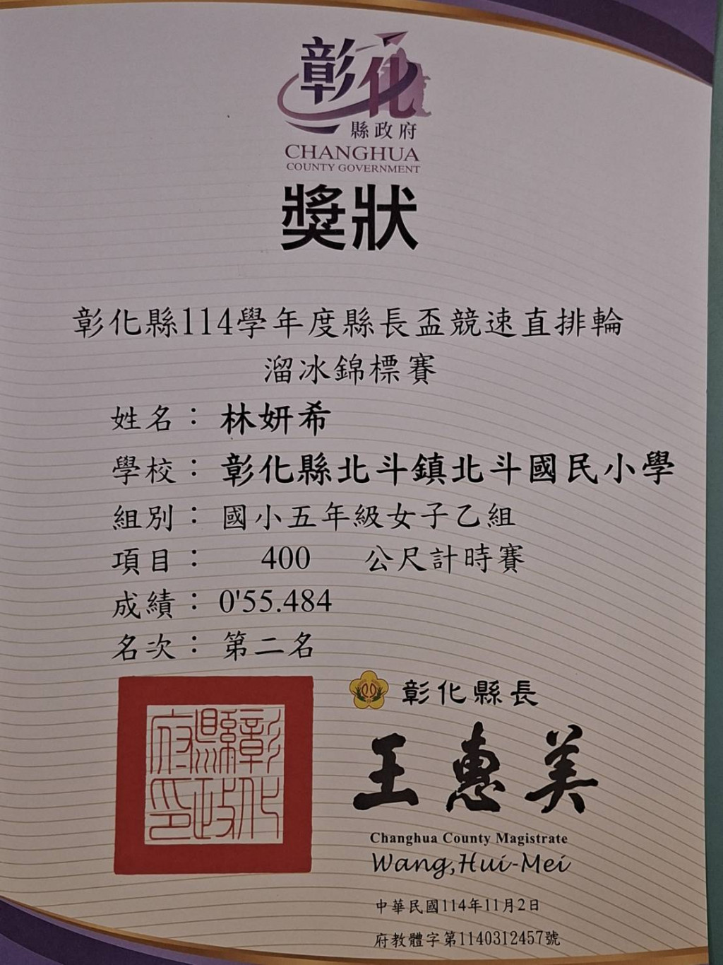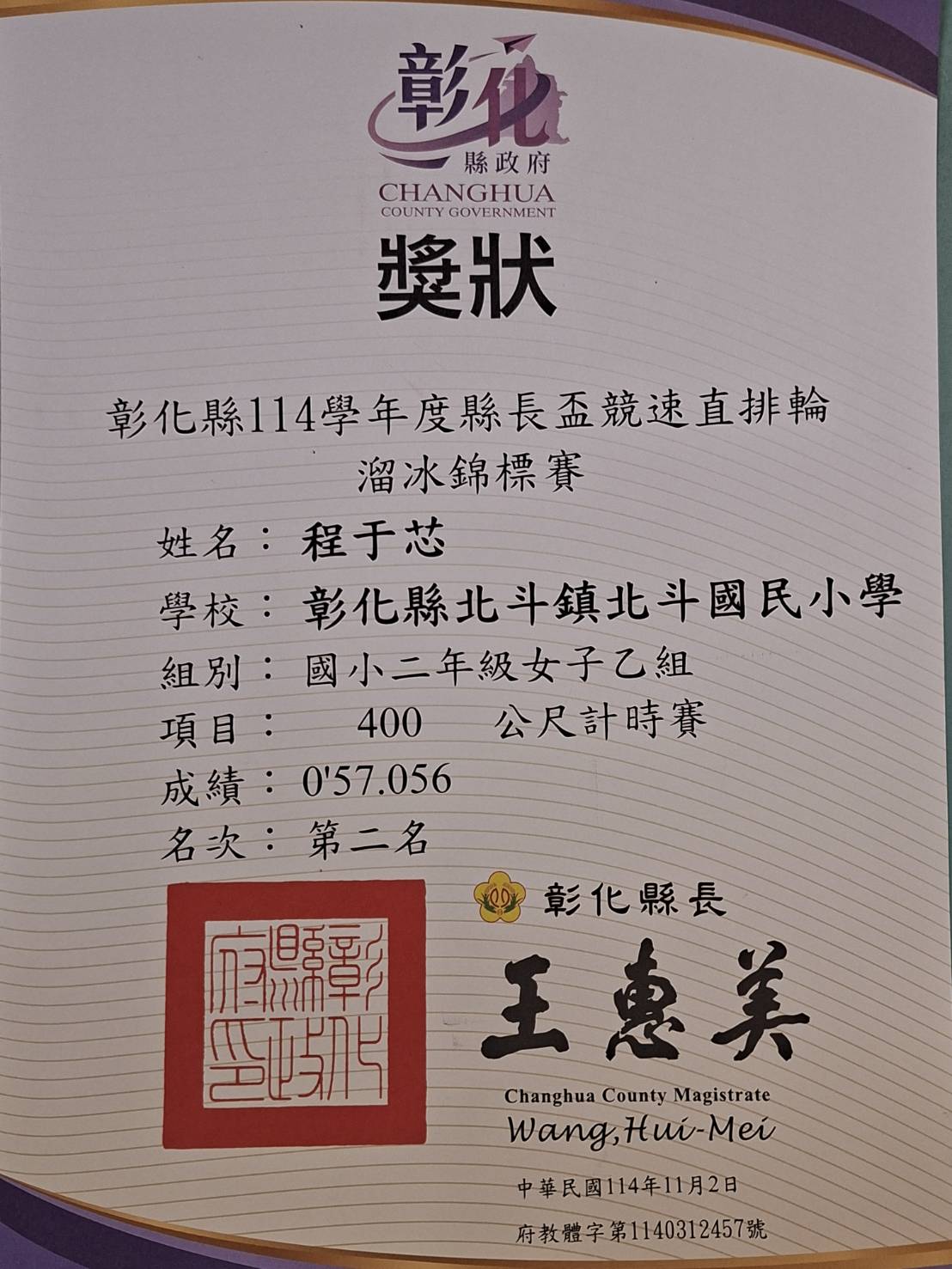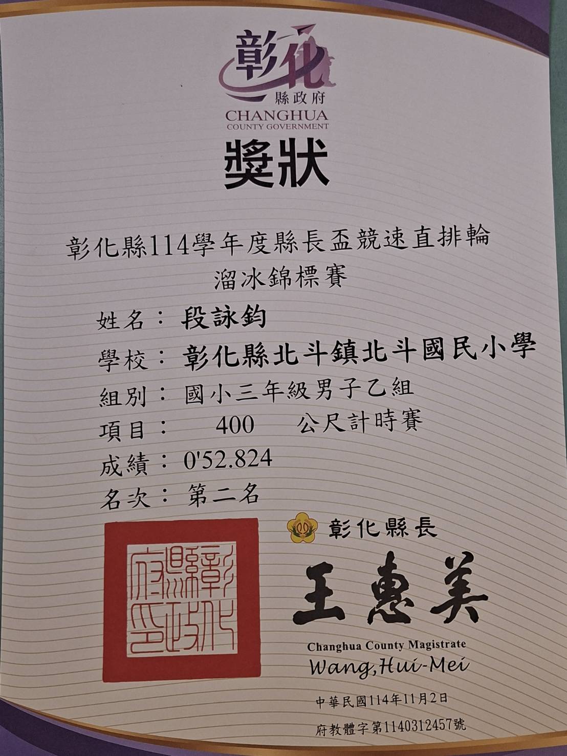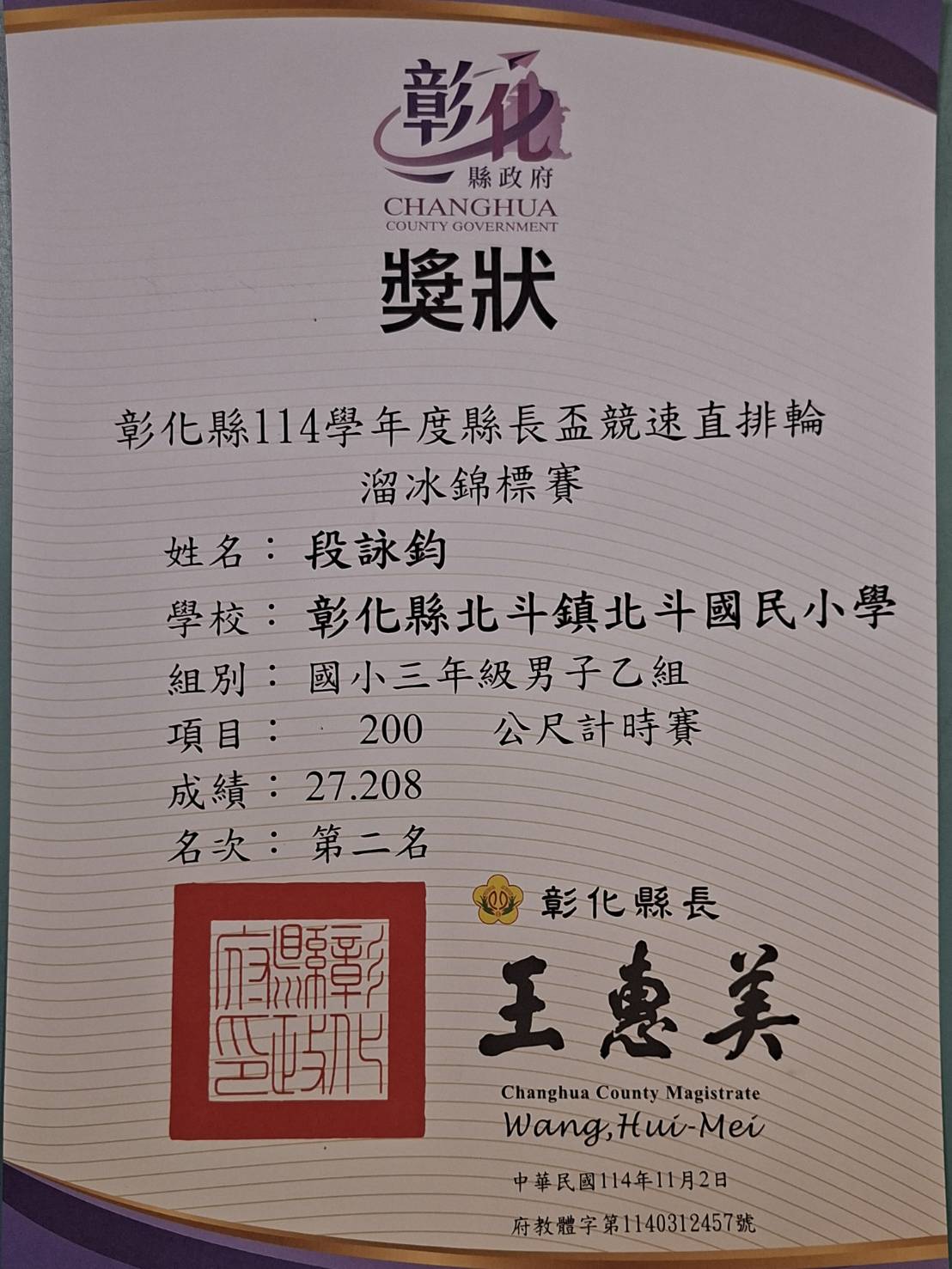 恭喜本校學生參加彰化縣114學年度縣長盃競速直排輪溜冰錦標賽榮獲佳績