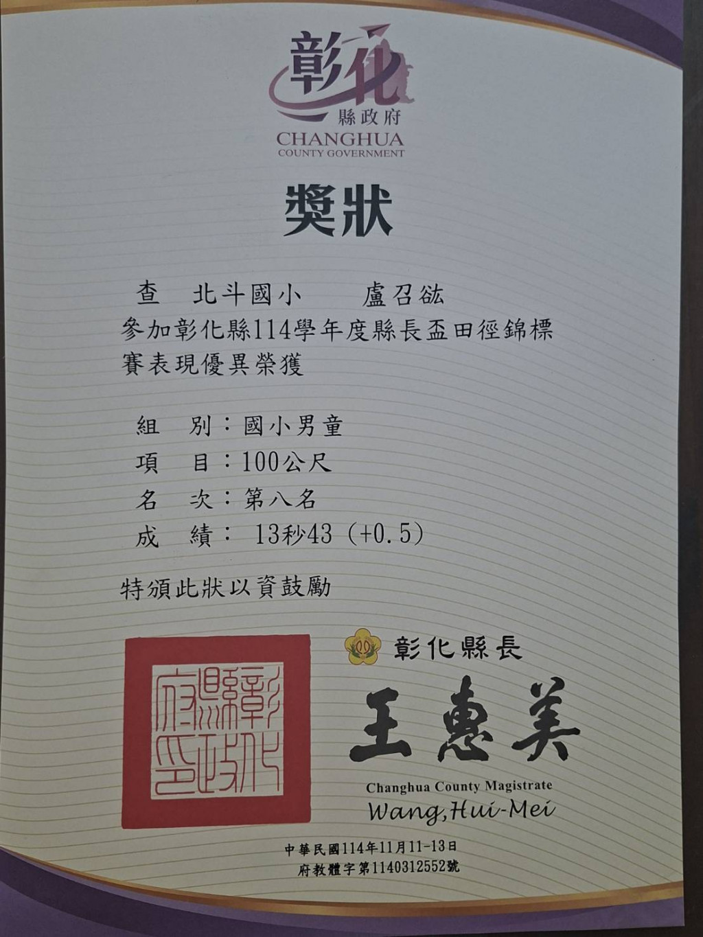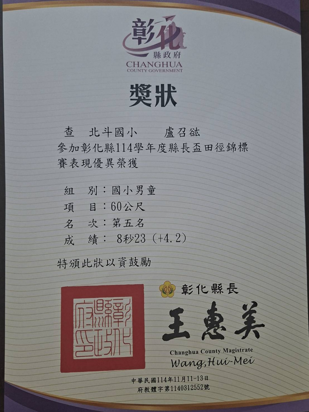 恭喜六丙盧召谹參加彰化縣114學年度縣長盃田徑錦標賽榮獲60公尺第五名 100公尺第八名