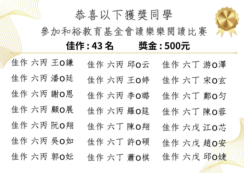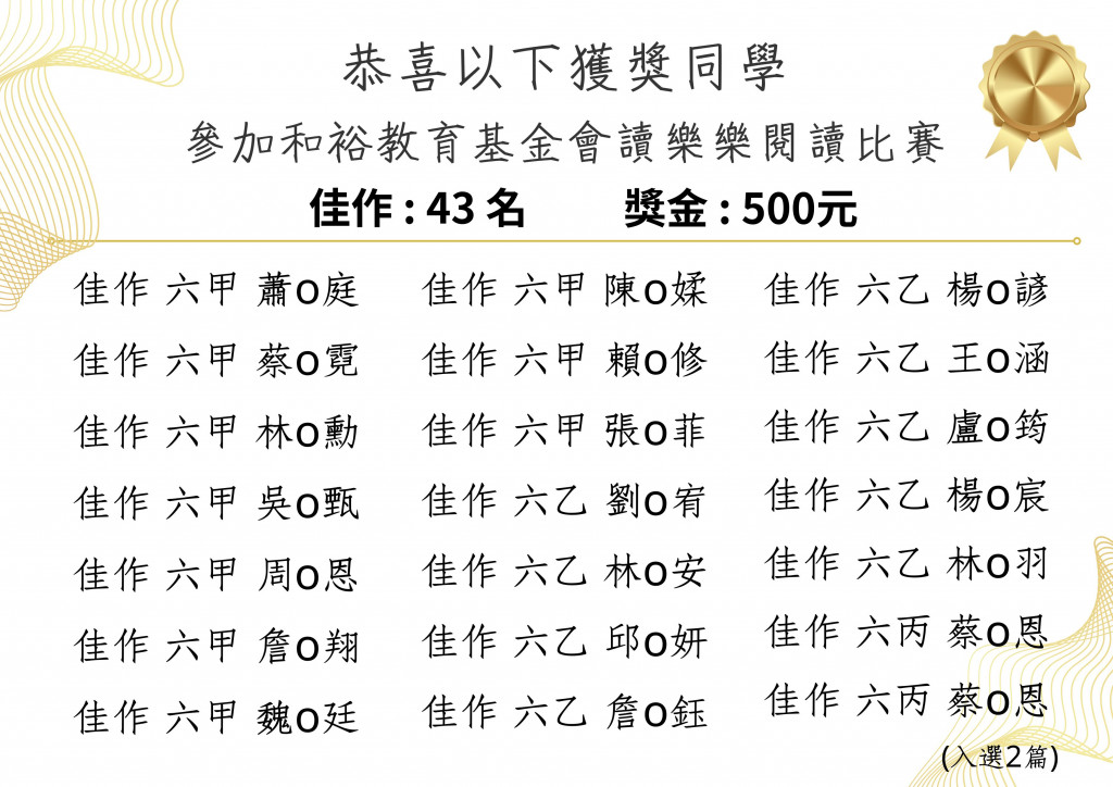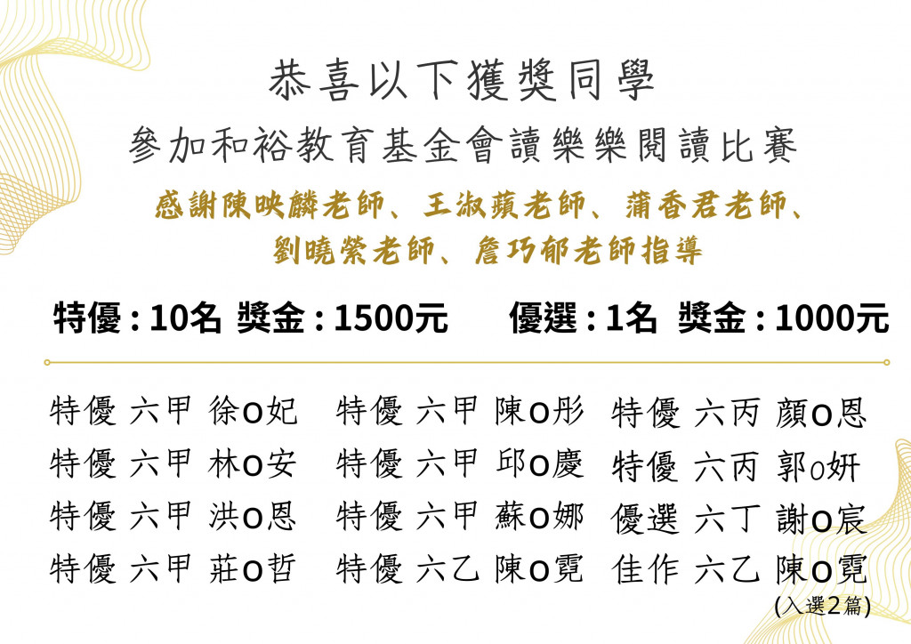 恭喜六年級同學參加114年度和裕教育基金會舉辦閱讀心得寫作比賽獲獎