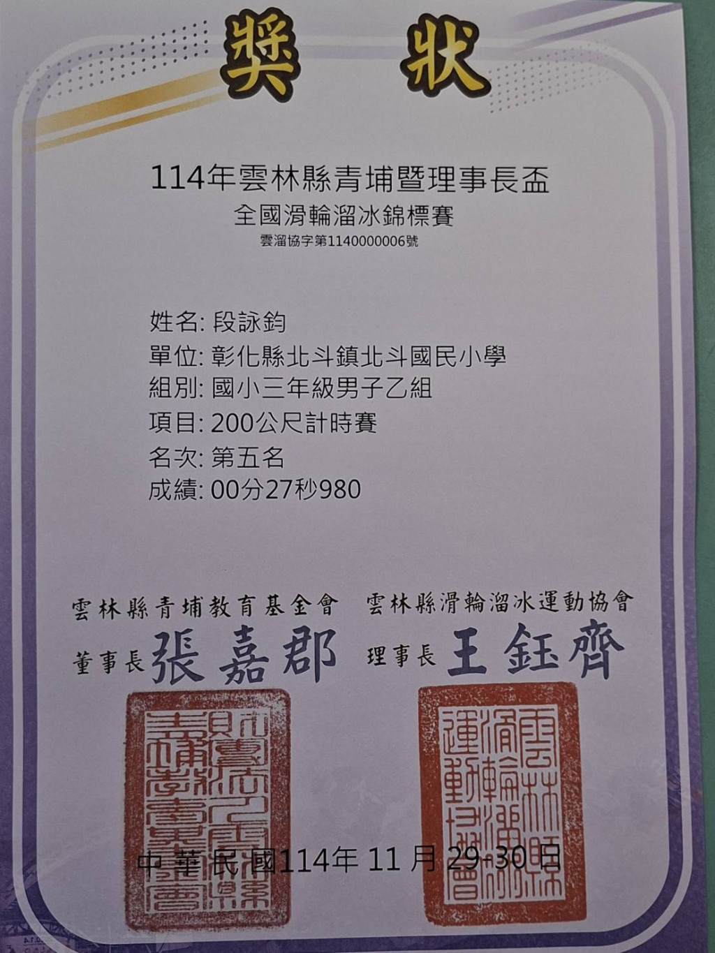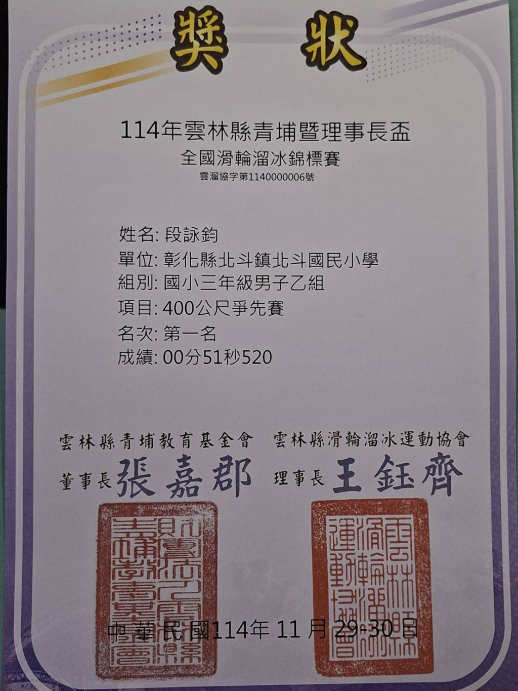 恭喜三戊段詠鈞小朋友參加114年雲林縣青埔暨理事長盃全國滑輪溜冰錦標賽榮獲佳績