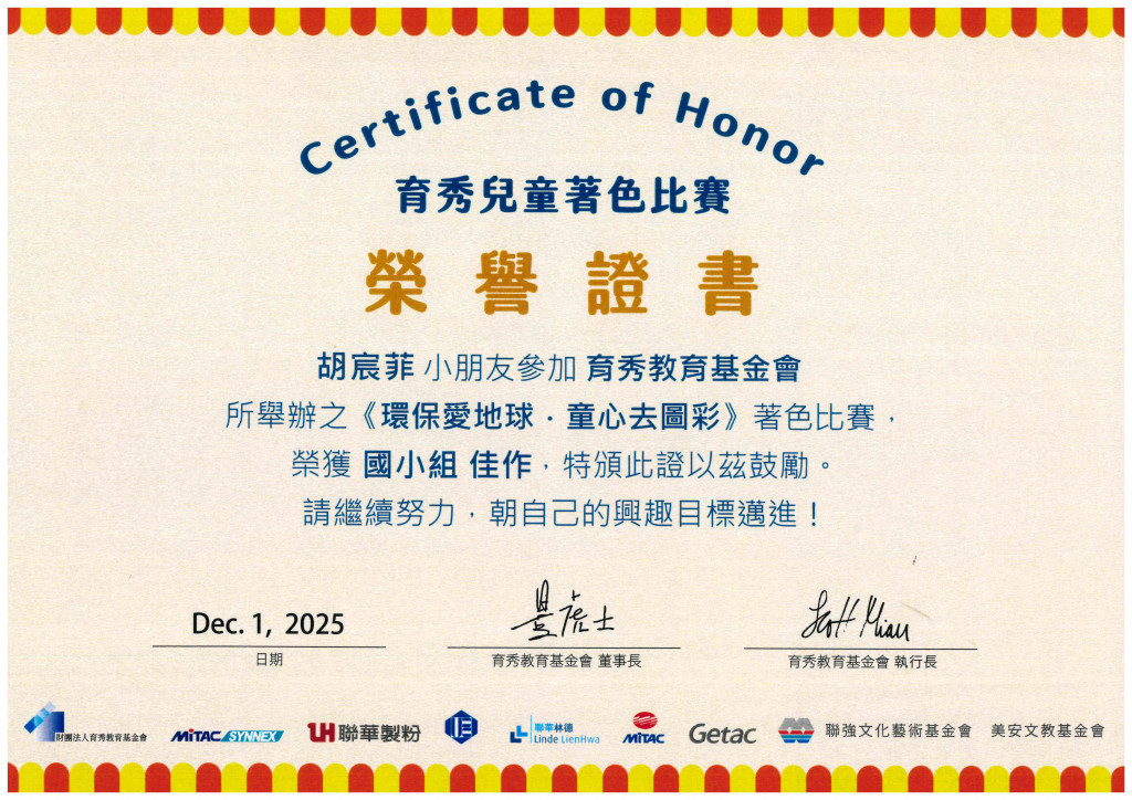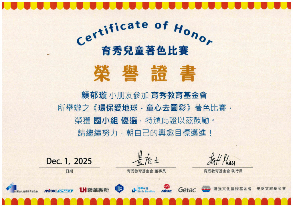 恭喜三戊顏郁璇、三丁胡宸菲參加2025育秀基金會能源小尖兵低碳馬拉松兒童著色比賽,榮獲佳績