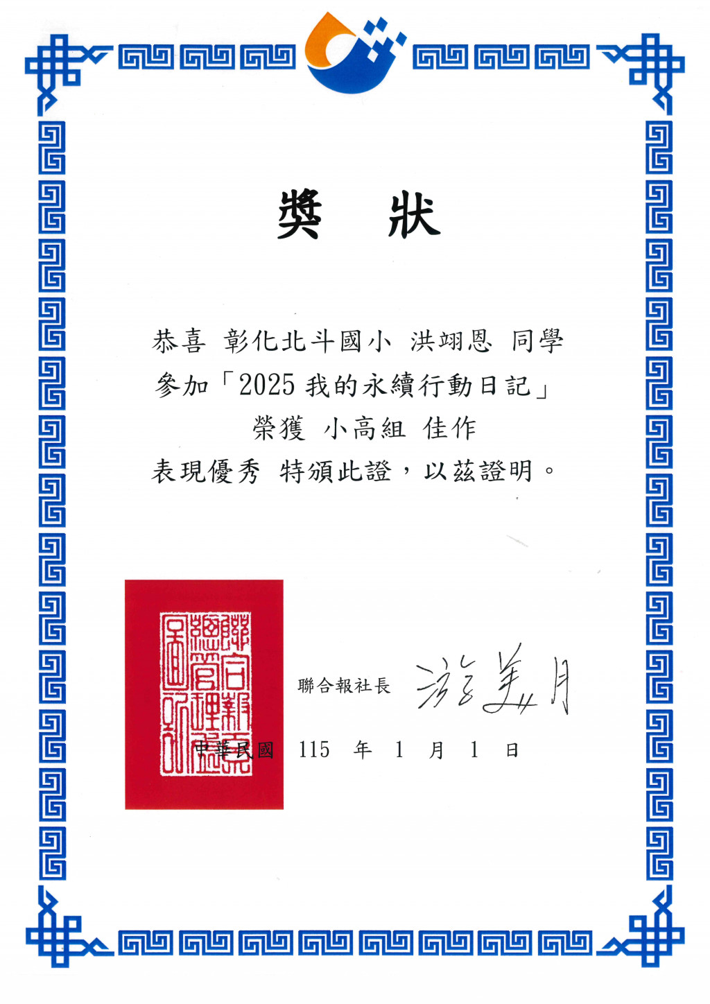恭喜六甲洪翊恩、四戊王依璇參加聯合報好讀周報舉辦「我的永續行動日記」暑假作業徵件,榮獲佳績