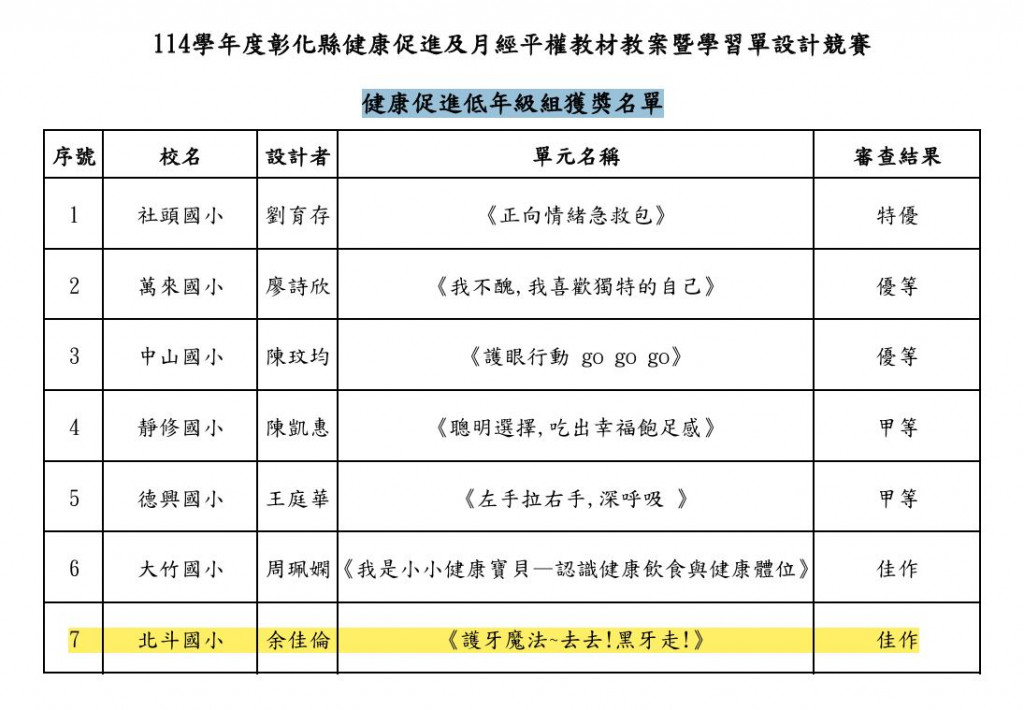 恭喜本校教師余佳倫 參加114學年度彰化縣健康促進及月經平權教材教案暨學習單設計競賽 獲得低年級組佳作