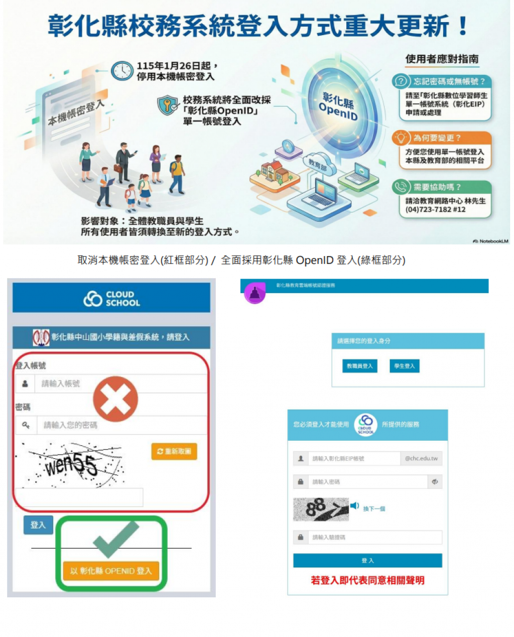 二、校務系統115年度維護暨功能擴充採購案,已支援教職員與學生利用彰化縣OpenID登入,將於115年1月26日起終止校務系統本機帳密登入,造成不便敬請見諒。