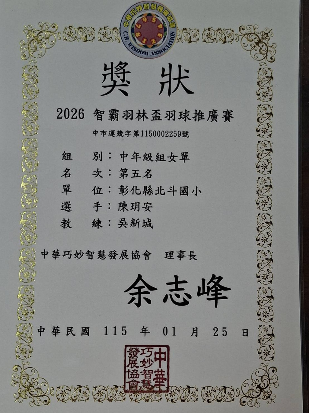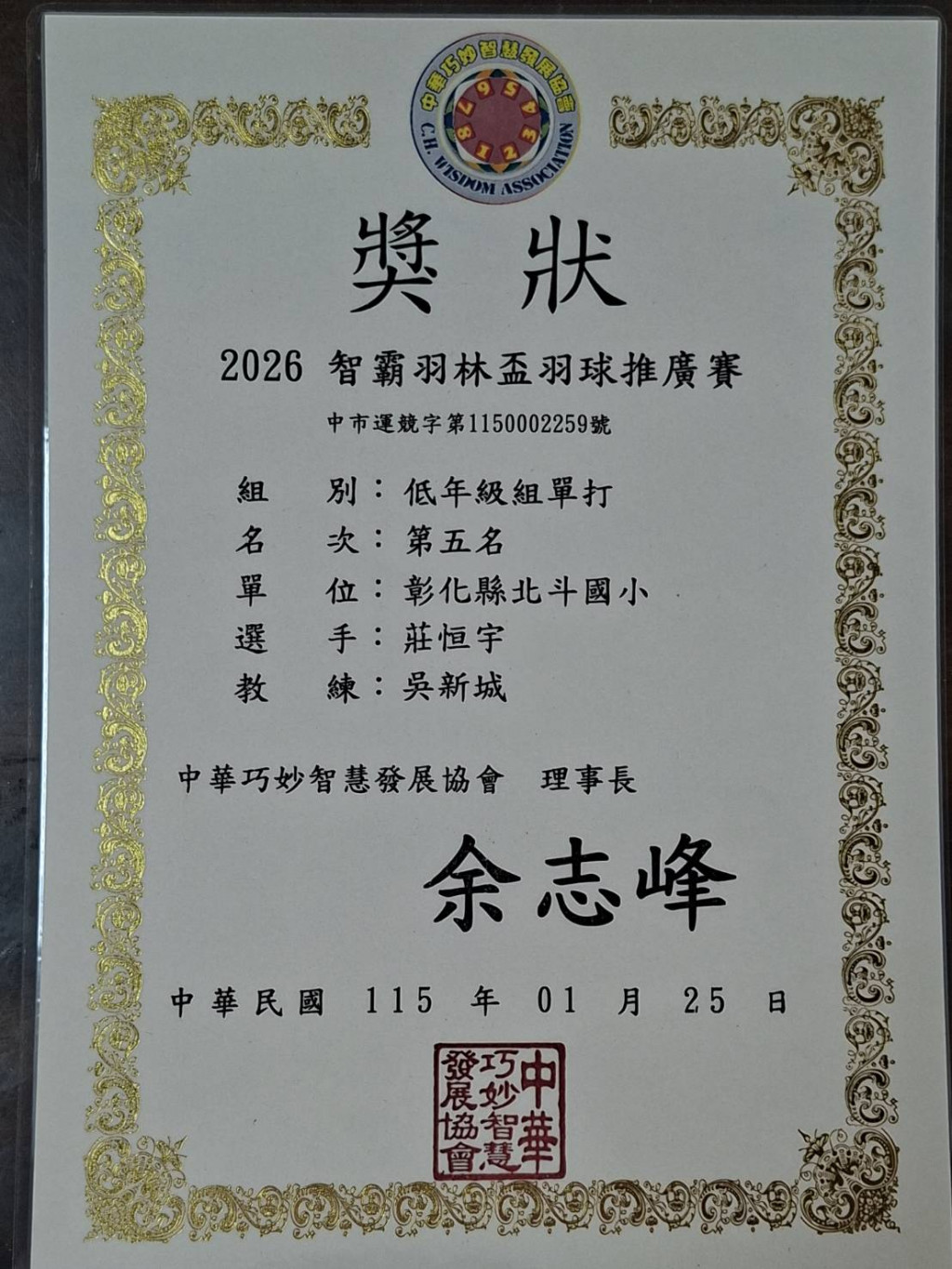 恭喜四丁陳玥安 二戊莊恒宇參加2026智霸羽林盃羽球推廣賽榮獲佳績