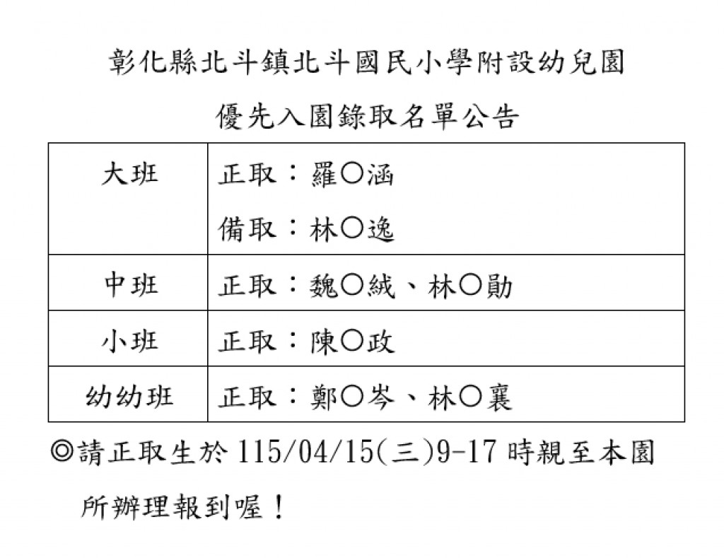 彰化縣北斗鎮北斗國民小學附設幼兒園 優先入園錄取名單公告